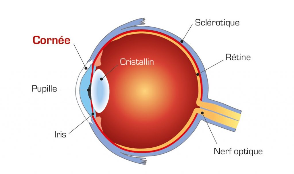 La cornée est la membrane transparente située à l’avant de l’œil. Elle fonctionne comme un petit hublot ou comme le pare-brise de votre voiture. Elle doit être transparente et régulière pour que les images se forment nettement sur la rétine qui est le capteur de l’œil.
